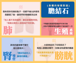 「苦痛來自於過去有些人對我不友善,而把我削弱了」、「那時候我有很多完美的點子,但都不被允許使用,我感到很悲憤」、「慢慢,我的通道被阻塞,我無法再推動更多的廢氣氧氣交換」、「因為我無法推動氧氣交換,身體慢慢變得沒有養分,器官們很多的憤怒流出,這些憤怒也讓腎臟無法消化」、「腎臟無法消化,大型垃圾就推不出去,就堵住了」