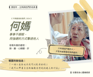 適合的療癒方式則是要帶何媽媽去探討兒時記憶與她認為導致一切變調的源頭,去探討自己在最在意的阻礙自己幸福的理由是什麼。可能是來自年幼時的一次談話,也可能是創痛事件發生後的遺憾等等,唯有回歸到事情當下的點去攤開在意的議題,才能夠徹底地將何媽需要「武裝自己測試安全度」的面紗取下,而改用「親易近人也能夠是安全的」信念前進。